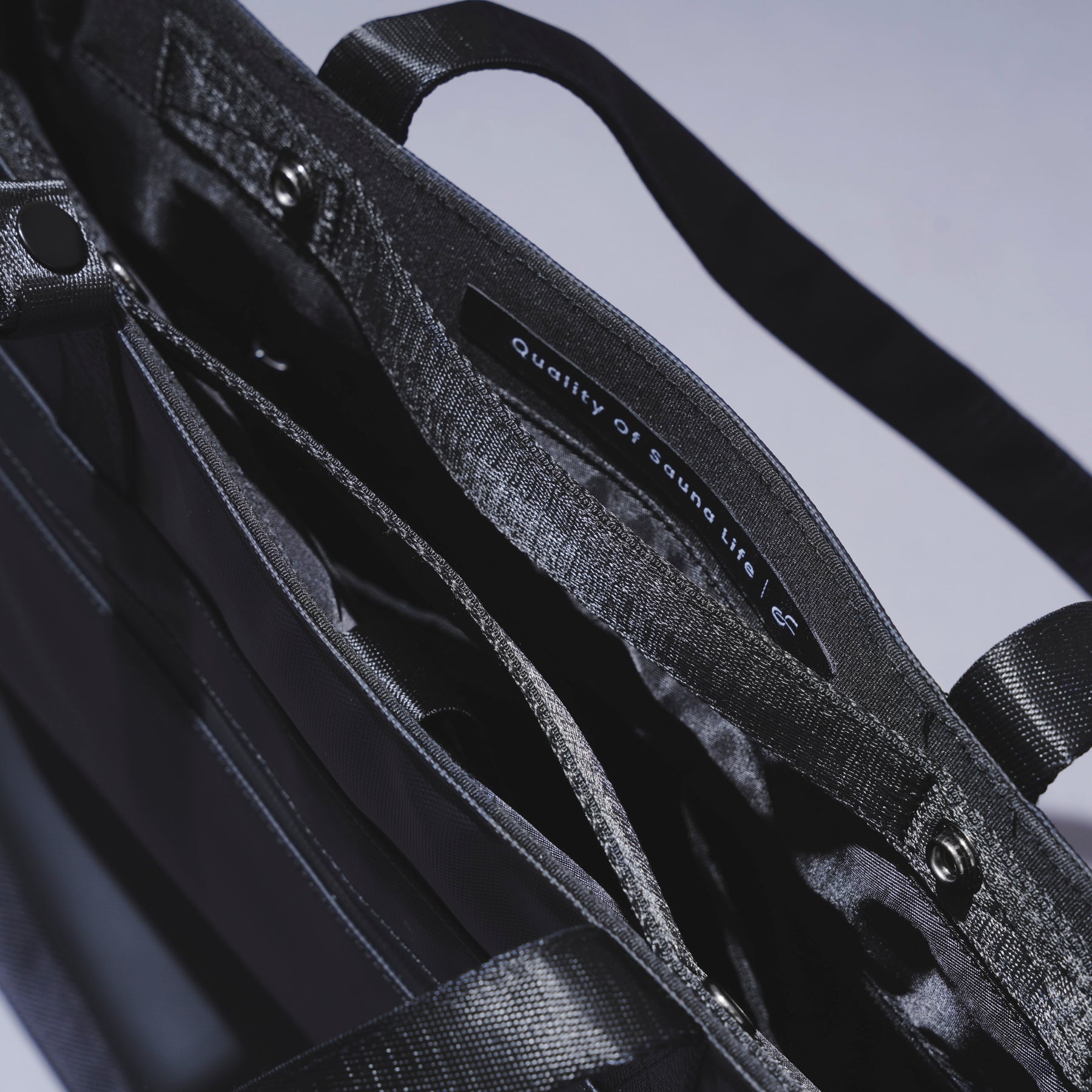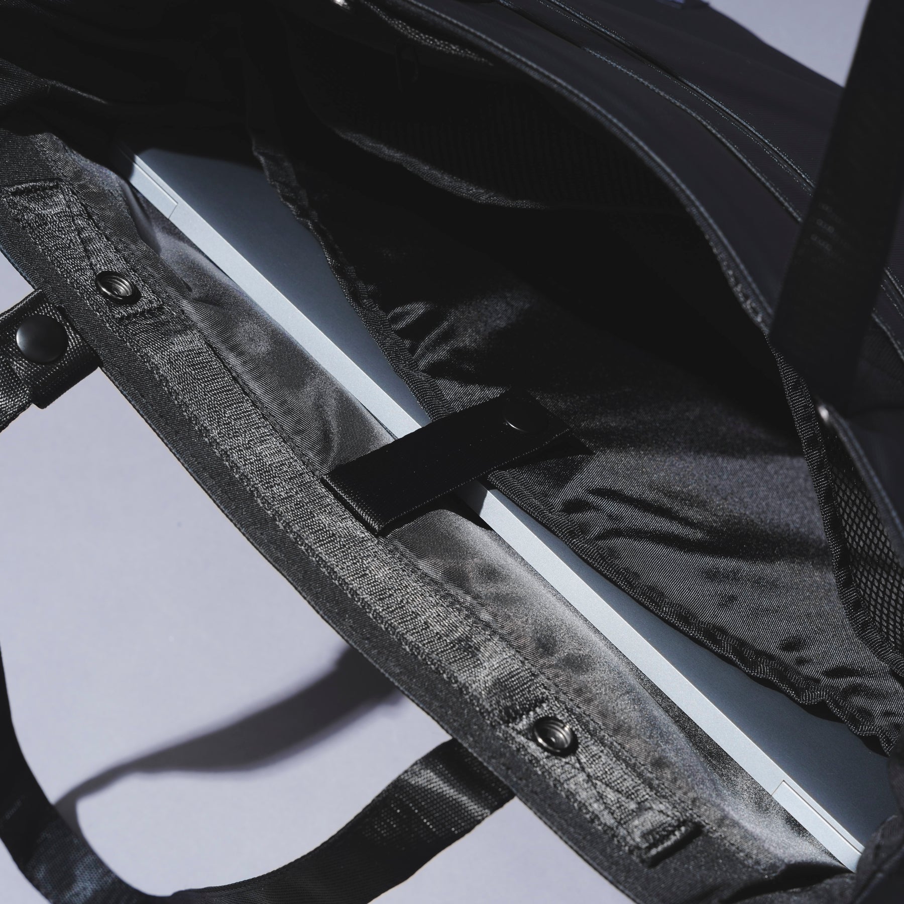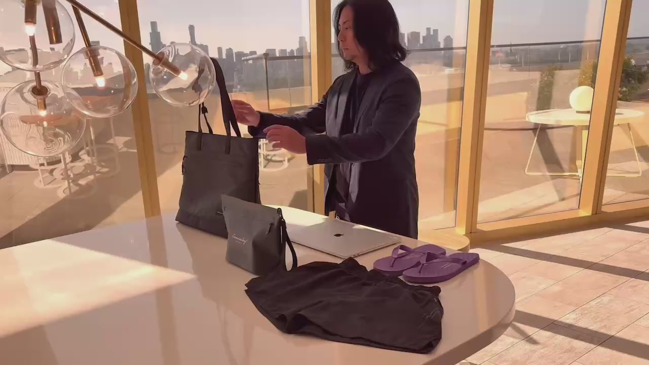 【背面】ロゴタグがなく、すっきりとしたデザイン。バッグ単体の重さは約670g。一般的に男性1kg前後、女性は800g前後までが快適に持てる重さと言われており、一般的なビジネスバッグの平均的な重さは1kg〜1.3kg程度。SAUNA LIFE BAGの軽量性は持ち運びのしやすさにも貢献している。 【PCポケット】ビジネストートバッグは数あれど16インチサイズのノートPCを持ち運べるタイプは意外と少ない。MAC BOOK PROなど、近年の高スペックで作業効率の高いノートPCは大型ディスプレーを採用する傾向にあるため、そのスペックのPCの収納を考慮した。 【ハンドル】長めに設定されたハンドルは、服を着込む冬場の寒い時期でも肩がけがしやすくなっている。幅が狭く厚みのある2重折り構造で、肩への掛け外しがスムーズに行えて耐久性も高い。 【ショートハンドル】手持ちのショートハンドルは内側に忍ばせ、見た目もスタイリッシュなデザインに仕上げた。ショートハンドルの内側にはSaunaonedayのタグラインである”Quality Of Sauna Life”の文字が隠されている。 【アウトルック】外側のメインファブリックには強度と高級感があり、撥水効果もあるナイロンオックスフォード900Dを採用。両サイドの大型のジッパーポケット内は水を弾くコーティング加工のポリエステル素材で、濡れたタオルや水着などを直接入れて持ち運ぶことができる。ジッパーラインも防水性のあるTPUでカバー。 【インナースペース】バッグ内側のメインスペースにはSPA CLUTCH BAGがすっぽり入る他、16インチノートPCが余裕で収まり、その他のガジェット類や着替えが収納できるメッシュポケットを2箇所備える。仕事用具だけではなく、サウナやジムで使うものや着替えも持ち運ぶことを考えた。 【セーフティーツール】時計やアクセサリーなどの小物が収納できるショートポケットや鍵が迷子にならない便利なキーリングも付いている。バッグの開閉はショートハンドルの部分のスナップボタンでサッとできる仕様。